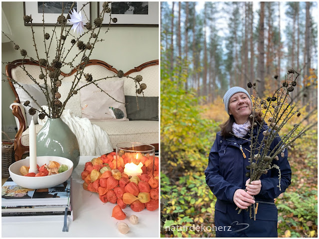 Heute muss ich ein wenig improvisieren, da ich keine frischen Blumen in der Vase habe. Ich hoffe meine Lärchenzweige gehen als Vasenfüllung für den letzten Friday Flowerday im November 2023 durch. Diese habe ich auf einem sonnigen Herbstspaziergang; in weiser Voraussicht, dass die Adventszeit ganz bald kommen wird; in der Dresdener Heide eingesammelt und mit nach Hause genommen.
